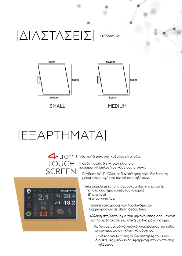 Το πρώτο και βασικό μοντέλο της σειράς των κρεατομηχανών Quattro με τα ιδιαίτερα χαρακτηριστικά της, όπως η κλίση των 10 μοιρών στο εμπρόσθιο και πίσω μέρος. Σχεδιασμένη σε τέσσερις βασικούς πυλώνες: το Design-την αξιοπιστία-τη Δύναμη και την Ταχύτητα. Μια τεράστια παλέτα χρωμάτων είναι στη διάθεσή σας, για να δώσει χρώμα και μοναδικότητα στην κρεατομηχανή σας, όπως μοναδική είναι και η προσωπικότητα του κάθε ανθρώπου.